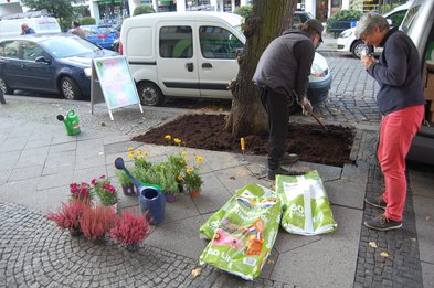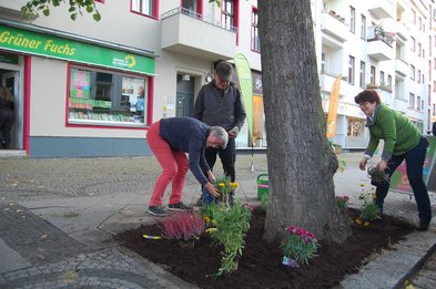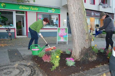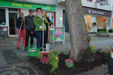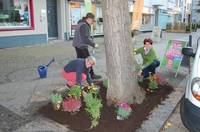 Ein Zeichen der Hoffnung für eine bessere Zukunft im Bezirk setzten die Reinickendorfer Grünen. Zusammen mit ihrer Bundestagskandidatin Stefanie Remlinger bepflanzten sie die Baumscheibe vor dem „Grünen Fuchs“ in der Brunowstr. 49 in Tegel.
