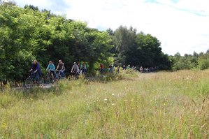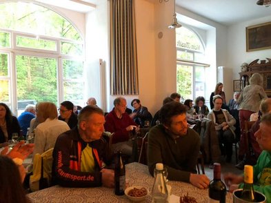 Rund 40 Radler*innen haben sich auch bei zweifelhaftem Wetter wieder in Hennigsdorf auf den Weg gemacht. In Hermsdorf setzt sich dann die Sonne durch. Und am Ziel gibt es Kaffee und Kuchen vom Grünen KV Reinickendorf.