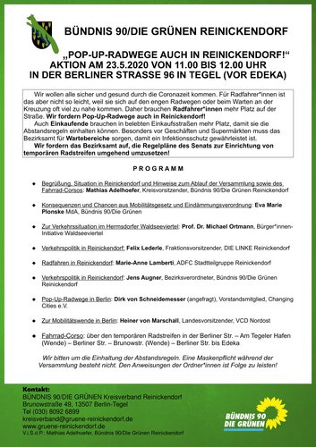 Am Sa. 23.05.20 rief der Kreisverband B90 die Grünen zu einer Demonstration auf. Unter dem Motto: „Pop-Up-Radwege auch in Reinickendorf!“ versammelten sich zahlreiche Radfahrer*innen und Interessierte in der Berliner Straße in Tegel. Sie forderten mehr Platz auf den Straßen für Radfahrer*innen und nahmen das Angebot wahr, sich über den aktuellen Trend für mehr Sicherheit und Gesundheit in Folge der Abstandsregeln zu informieren.