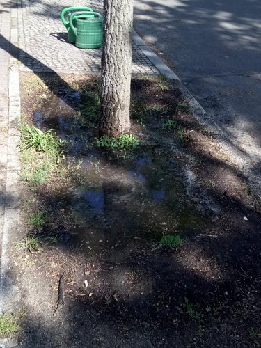 Aber allzu oft geht Gießen gar nicht, weil das Gießwasser auf die Asphaltstraße wegfließt und die Baumwurzeln nicht erreicht.