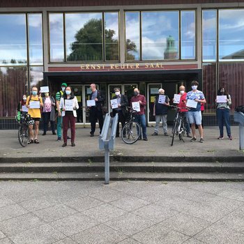 Die Bündnisgrünen in Reinickendorf nutzten die letzte BVV-Sitzung vor der Sommerpause am Mittwoch, 10.6.20, um ihrer Forderung nach Einrichtung von temporären Radwegen in Reinickendorf Nachdruck zu verleihen. Der Kreisverband der Bündnisgrünen in Reinickendorf hatte zu der Demonstration vor dem Rathaus Reinickendorf aufgerufen, nachdem ein gemeinsamer Antrag der grünen Bezirksfraktion und der Fraktion Die Linke für geschützte Radwege am Widerstand von CDU, AfD, SPD und FDP gescheitert war.
