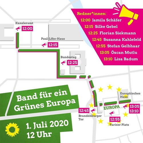 Die Aktion "Band für ein Grünes Europa" der LAG Europa ist eine Botschaft für Klimaschutz, soziale Gerechtigkeit und Menschlichkeit an die deutsche Bundesregierung, die am 1. Juli 2020 die EU-Ratspräsidentschaft übernimmt.